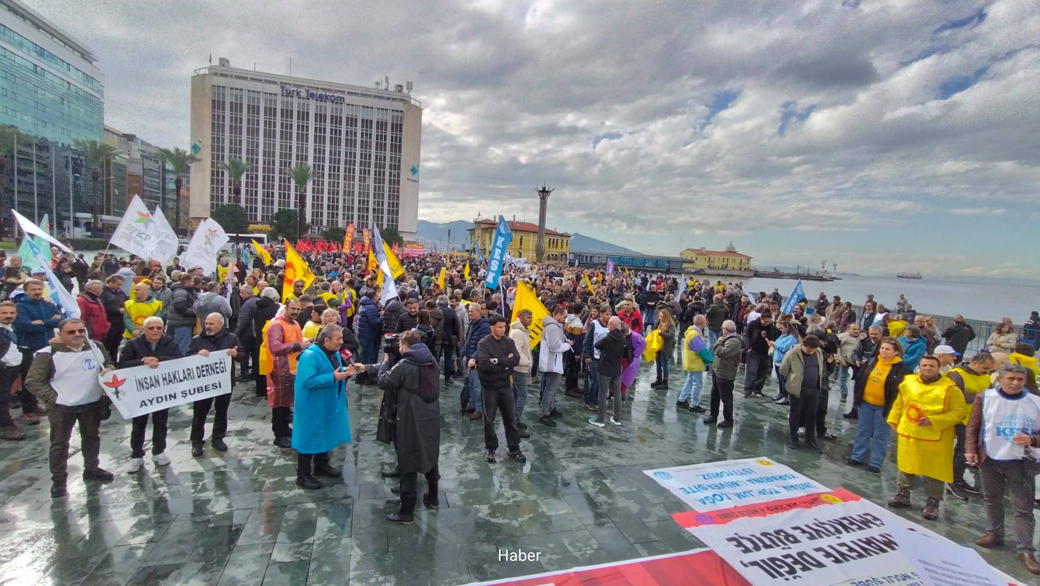 İzmir’de yağmura rağmen gerçekleşen mitinge ise 10 bine yakın kamu çalışanı katıldı. Cumhuriyet Meydanı’nda toplanan kalabalığa seslenen KESK İzmir Şubeler Platformu Dönem Sözcüsü Başak Edge Gürkan, şunları söyledi,  “Değerli işçiler, emekçiler, kamu emekçileri, emekliler, gençler, kadınlar emeğiyle geçinip bütçeden hakkını talep etmek için yollara düşenler hoş geldiniz. Manisa’dan, Balıkesir’den, Uşak’tan, Denizli’den, Muğla’dan ve tüm Ege Bölgesinden  gelen tüm emekçiler, GEÇİNEMİYORUZ diye bugün meydanlara inen tüm İzmir halkı hoş geldiniz. Ve bugün bu mitingi örgütleyen bileşenleri alın teriyle bu bütçenin yüzde 90’nını üretip yüzde 10 bile pay alamayan işçi, emekçilerin temsilcileri KESK, TÜRK-İŞ, İzmir Tabip Odası, İzmir Barosu üyeleri ve hakları için direnen Temel Conta işçileri, Digel Tekstil işçileri hoş geldiniz”
